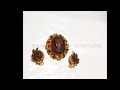 This gorgeous demi parure by DeLizza & Elster is decorated with a stunning, fancy-molded, caramel cameo, a glitzy combination of topaz & and sun stones, and is finished in gold-tones.